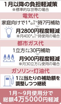 政府は、この電気・都市ガス代の値引きとガソリンなど燃油補助を合わせて、1月から9月使用分の負担軽減額が、標準家庭で総額4万5000円程度になると見込んでいます。