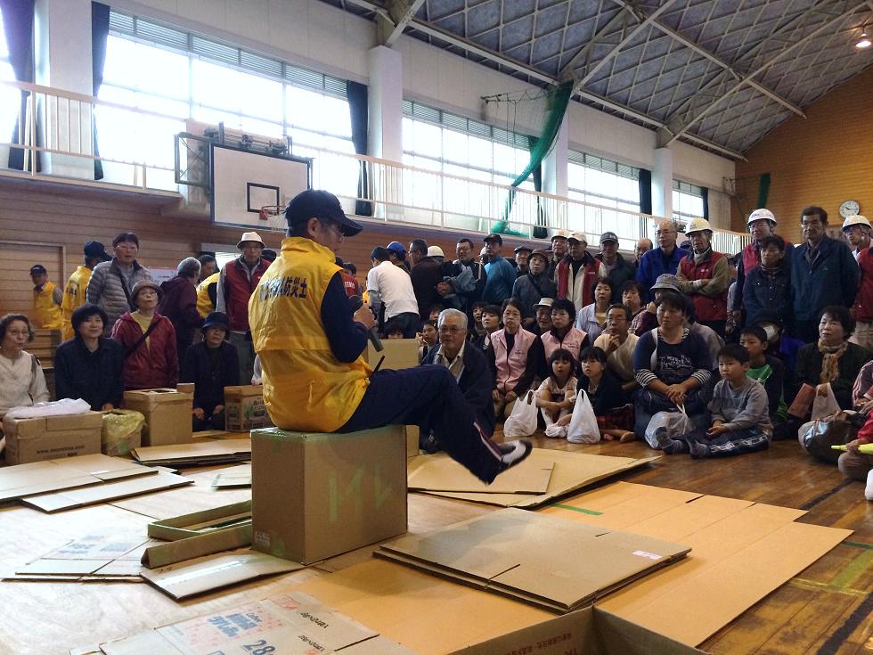 雄郡小学校体育館を2次避難先と見立て、