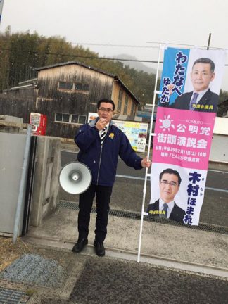 粉雪舞う中、渡部議員と街頭演説を敢行。