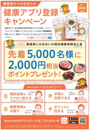 本事業は、利用者に生活習慣の改善や自発的な健康づくりの取組みを促しながら健康寿命の延伸や医療費の適正化を図ることを目的とし、愛媛県とDeSCヘルスケア株式会社(DeNAの子会社)によるスマホ用健康管理アプリ「kencom」を活用した「健康づくりを支援する事業」です。