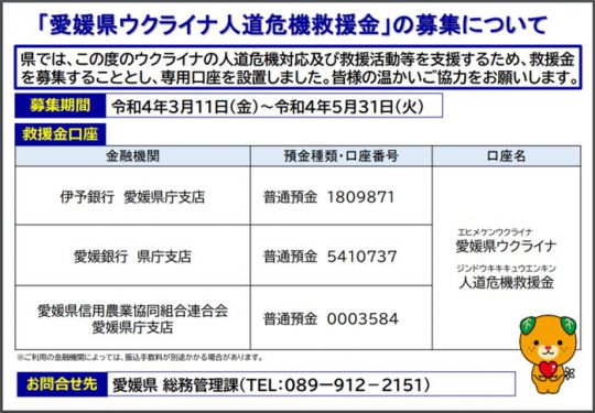 皆様におかれましては「愛媛県ウクライナ人道危機救援金」に対しまして、どうかご理解とご協力を賜りますよう何卒宜しくお願い申し上げます。