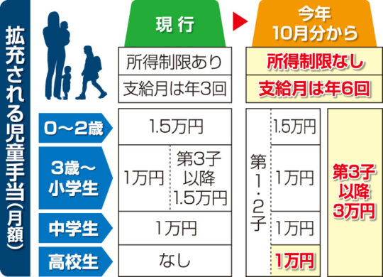 これまでの公明党の粘り強い取り組みにより、拡充後は所得制限が撤廃され、現行の“中学3年生まで”から“高校3年生(高校生年代)まで”と支給期間が大きく延長されます。