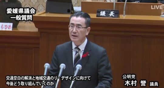 今後とも、地域の実情や利用者のニーズに応じた移動手段の確保に向け、AIデマンド交通導入など市町の取組みを後押しする新モビリティサービス導入促進事業の実施や、燃油価格高騰と人手不足に苦しむ交通事業者の省エネ・人材確保対策を支援することで、交通空白の解消と地域交通のリ・デザインに向け、オール愛媛で取り組んでまいりたいと考えております。」