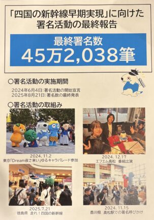新幹線はすべての国民が等しく享受できるサービスであるべきで、全国が繋がってこその鉄道網であり、そのネットワークから唯一置き去りにされた四国の今の状況は、これ以上ない地域格差という他ありません。