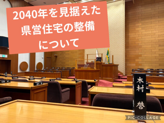 昨年の6月定例会で会派の乗松議員から、県営住宅の空き住戸について、“上層階を若者世帯に優先的に貸与する”、“子育て世帯には家賃減額などの優遇措置を実施する”、“学童保育や子ども食堂など地域交流の場として活用する”などの提案がありましたが、私も又、高齢化のピークとされる2040年を見据えた県営団地のアップデートを、できるところから着実に図っていくべきと考えます。