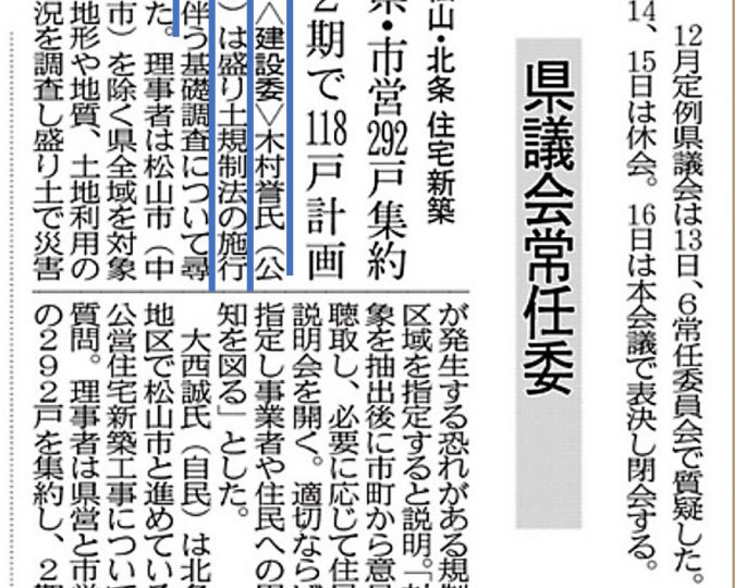 昨日行われた県議会常任委員会の概要が、本日の愛媛新聞に掲載されました。 私は所属する建設委員会で、“盛土”に関して質問。