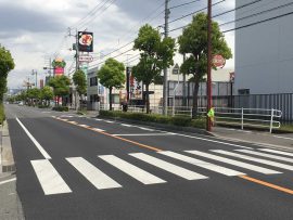 「県道松山空港線(空港通6丁目付近)について、信号機が東西に離れているため信号機のないところを横断する人が多く危険であり、近隣に障がい者就労施設もあるため横断歩道を設置してほしい」とのご要望が吉冨議員から寄せられ、県警に申し入れ。その後、県警、松山西署、県、地元関係者で協議を重ね、横断歩道と横断旗が新設され、周辺区間の道路についても舗装改修を行いました。