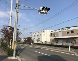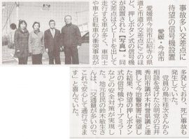 「県道交差点(今治市広紹寺町)は下り坂すぐということもあり、スピード走行車が多く事故が絶えない。安全対策を講じてほしい」とのご要望を受け、石井議員と連携し、県警・今治市に申し入れ。路面標示やカーブミラーなど改良を重ねながら4年がかりで押しボタン信号機を設置。危険交差点の安全対策を推進することができました。