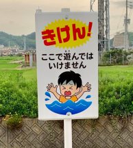 「先月、小学生の児童が亀を取るため川に入り、危うく水難事故になりかけた。安全対策を講じてほしい」とのご要望を受け、中予地方局に申し入れ。検討の結果、川へ下りる階段を塞ぐことは河川管理や農業用取水等の点で困難なため、児童に注意喚起を促すイラスト看板を設置しました。